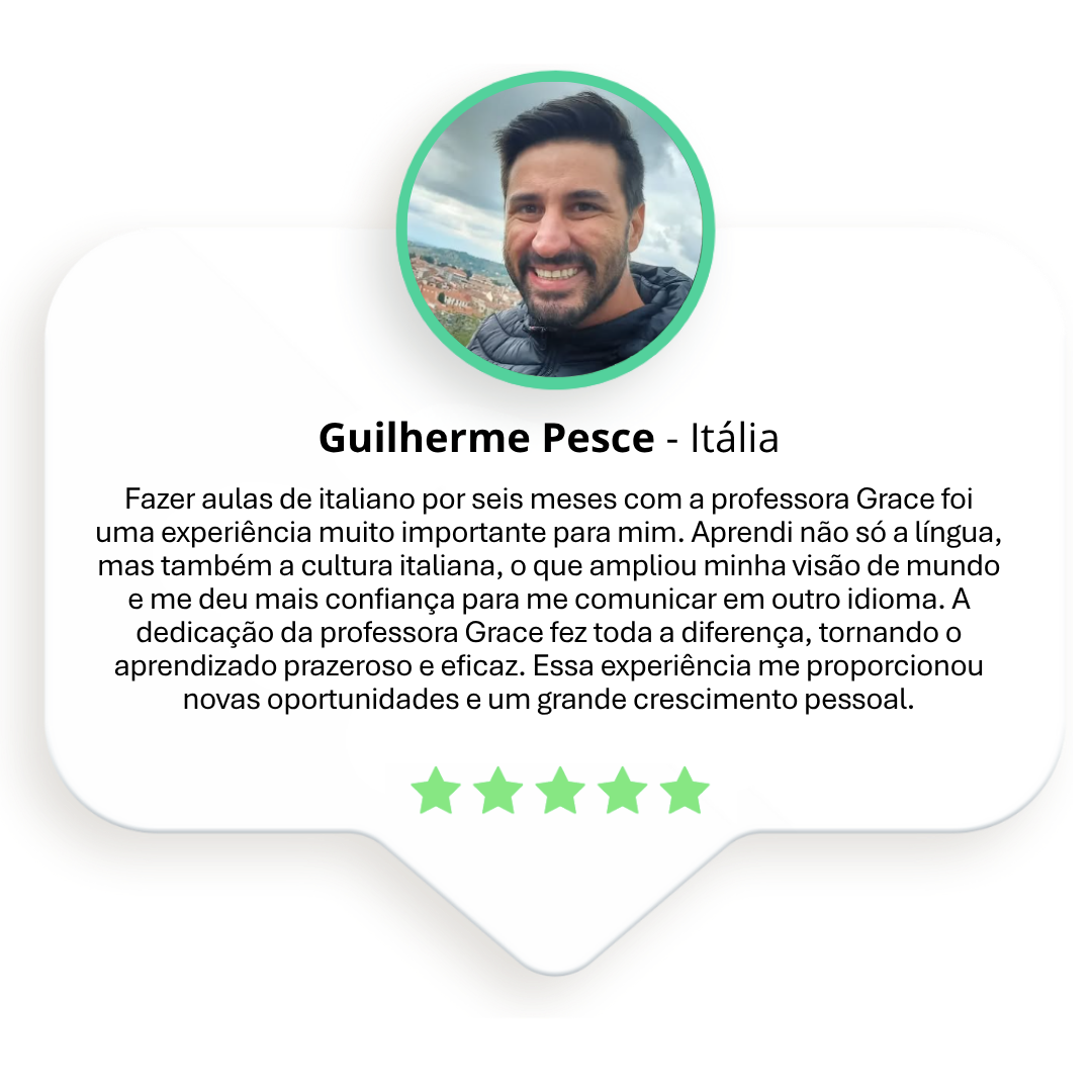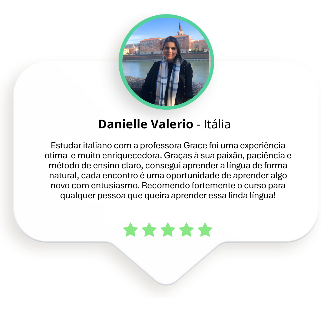 Aqui, você fala italiano desde a primeira aula, aprende com uma professora especializada e apaixonada pela língua e pela cultura italiana, e segue um método que já ajudou muitas pessoas a alcançarem a fluência de forma leve e natural.