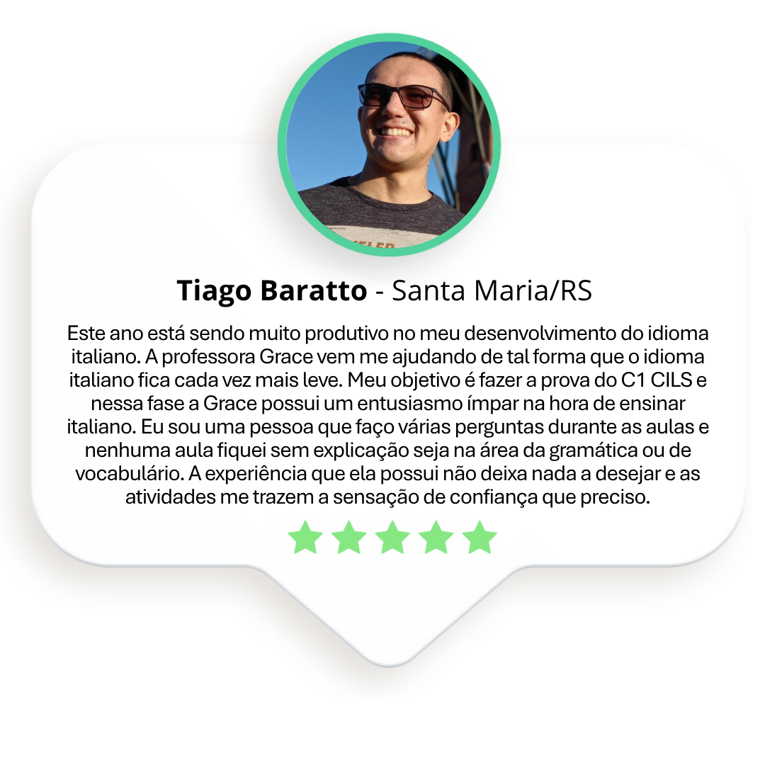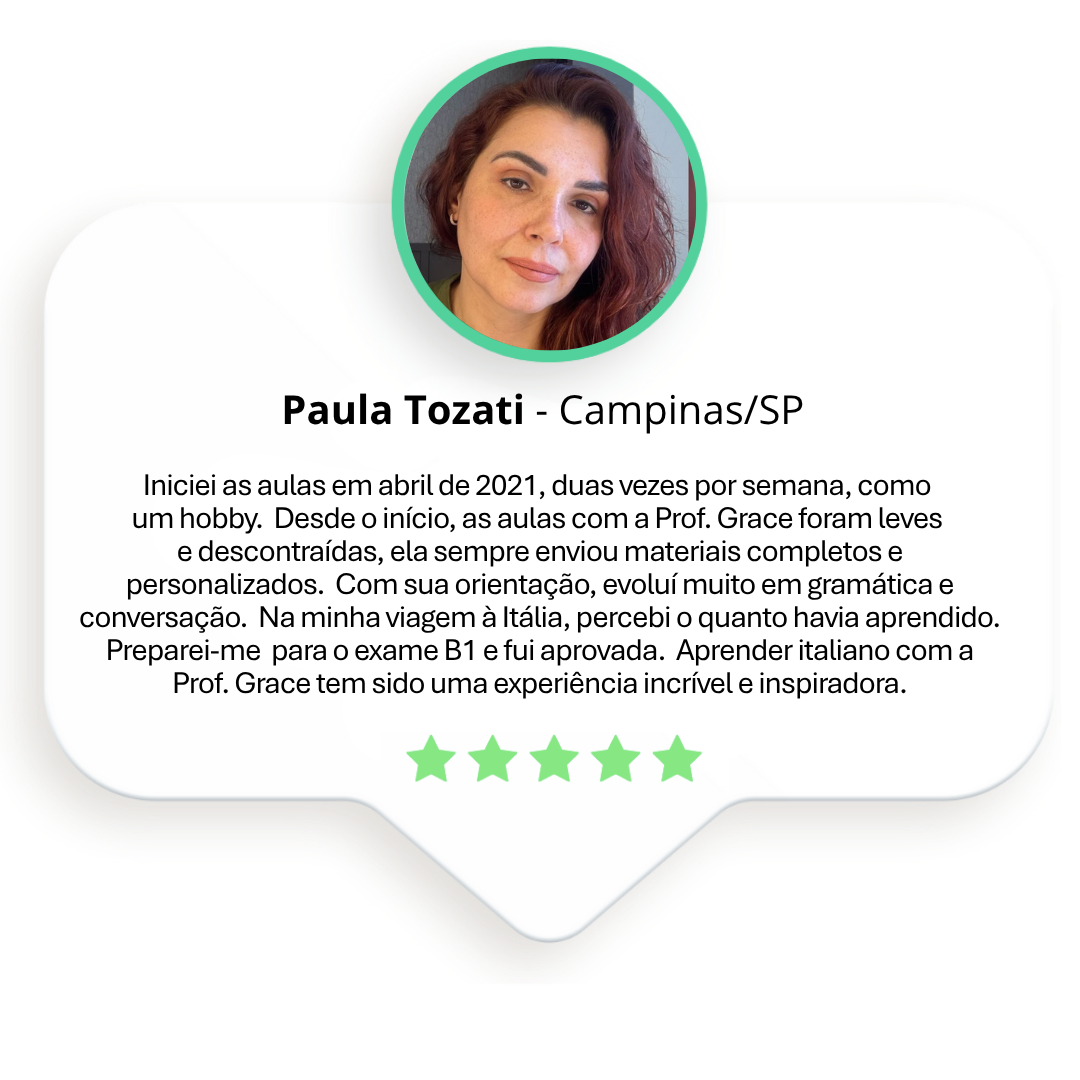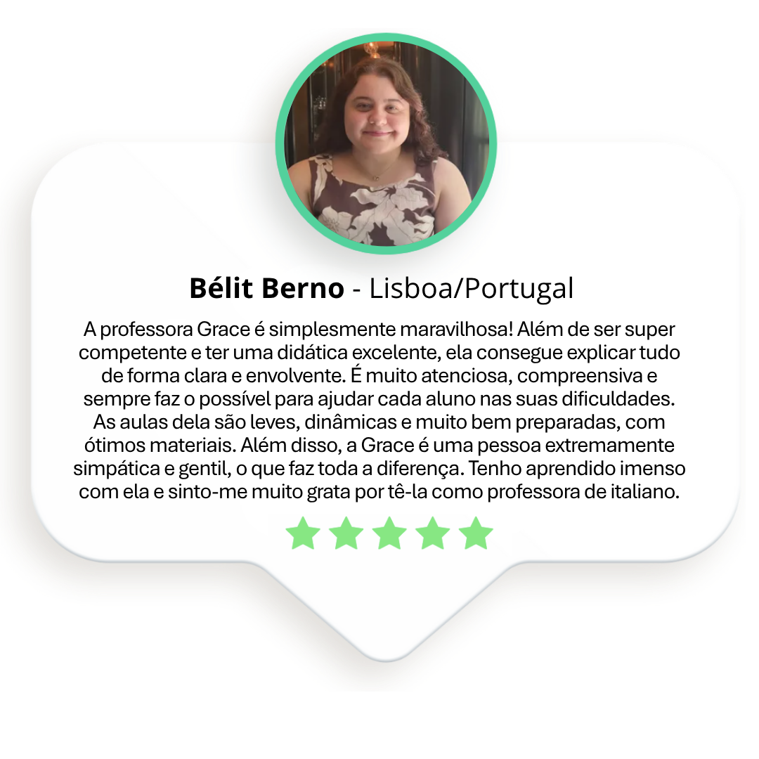 “Aprender italiano é muito mais do que estudar gramática. É se permitir viver a língua — e é isso que eu amo ensinar.” — Prof.ª Grace Ivo
